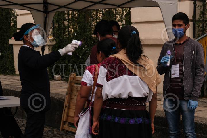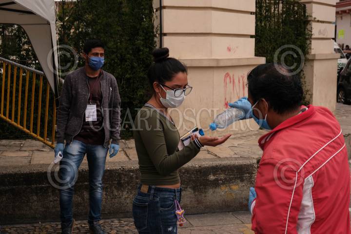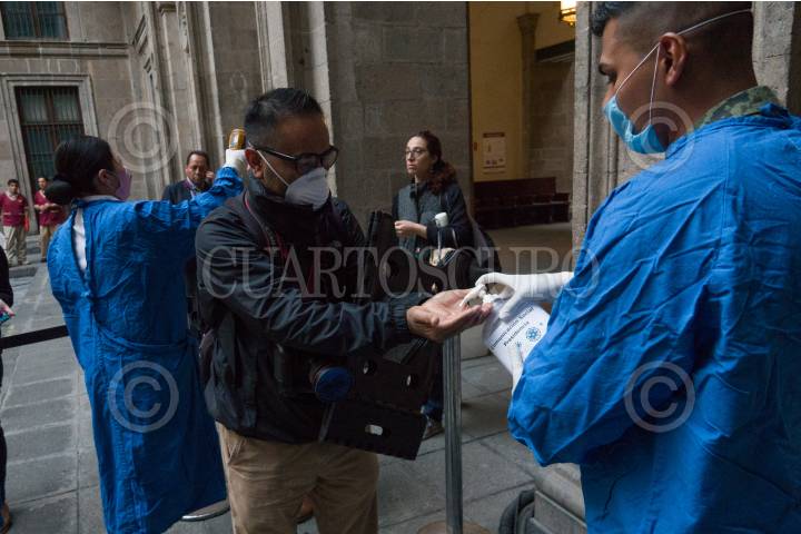 A reporteros que cubrieron la conferencia del Jefe del Ejecutivo en Palacio Nacional personal de salud les tomó la temperatura y les brindó gel antibacterial como parte de la medidas sanitarias en contra del Covid-19