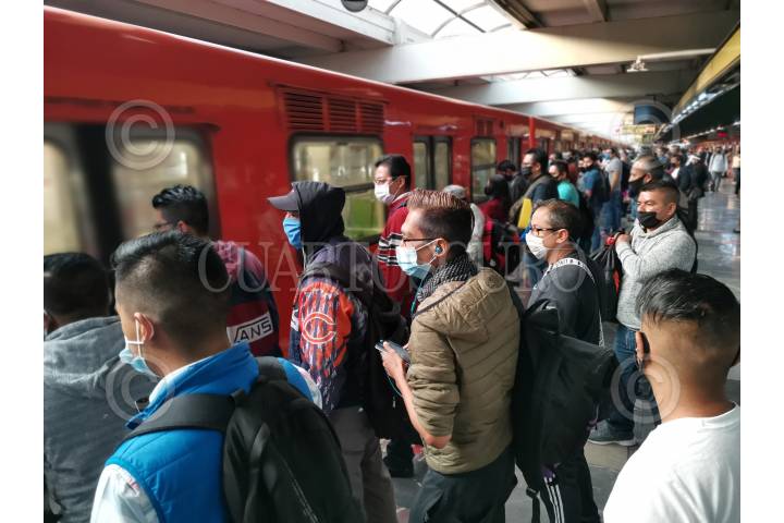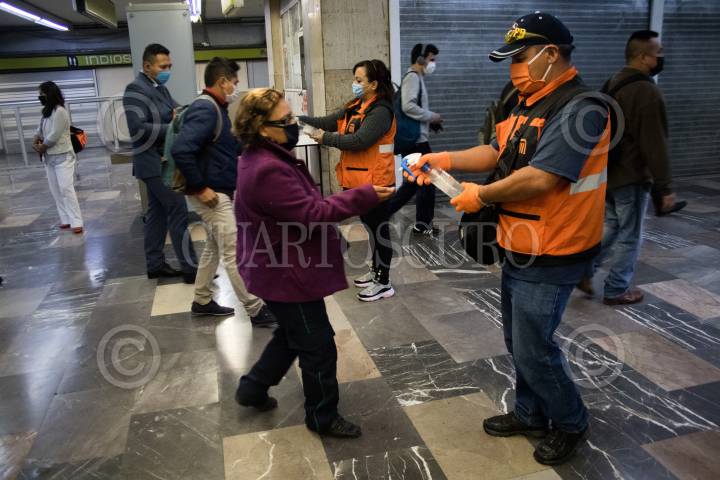 En la estación del metro Indios Verdes usuarios reciben gel antibacterial, aunque es difícil mantener la sana distancia en la espera de los covoys.
