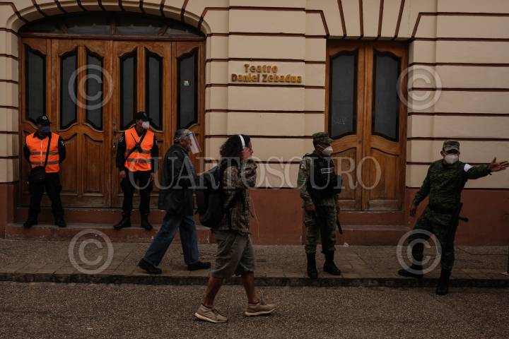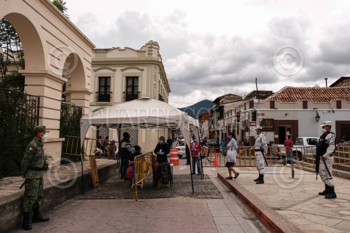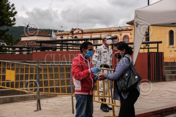 Integrantes de la Guardia Nacional y Policía Municipal, resguardan los filtros sanitarios instalados en le centro de la Ciudad.