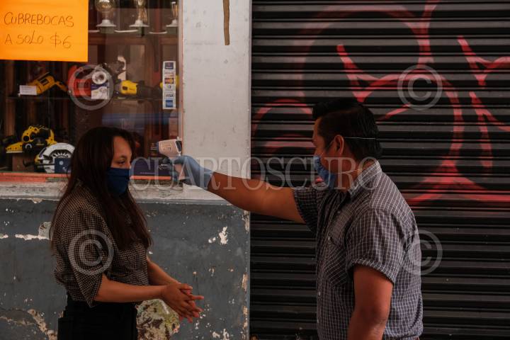 Personal de la Secretaría de Salud municipal mide la temperatura a los peatones en el centro de la ciudad.