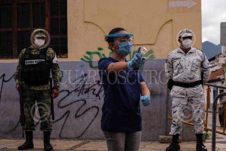 Elementos de la Guardia Nacional resguardan los filtros sanitarios instalados por las autoridades municipales.