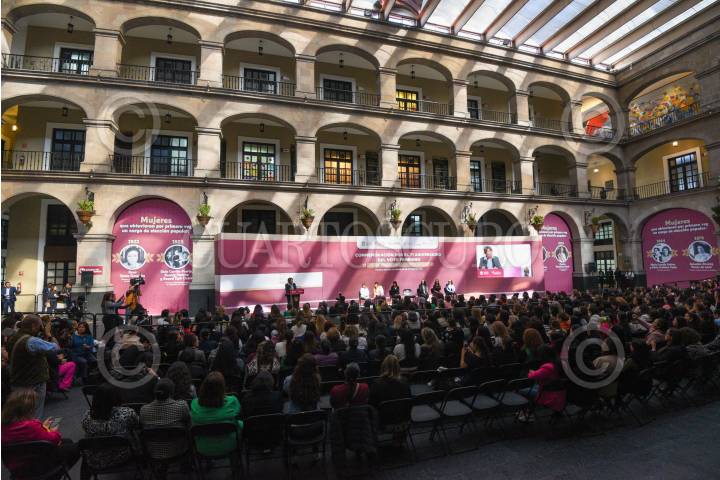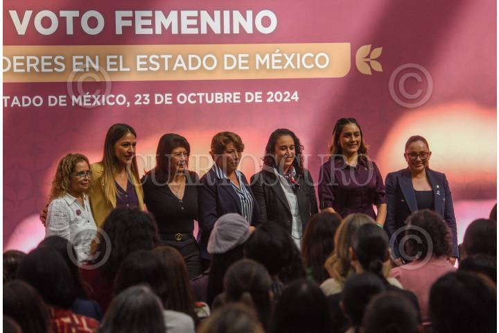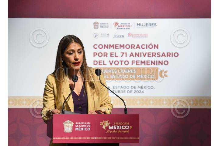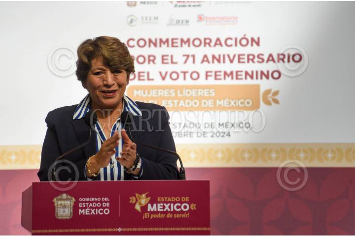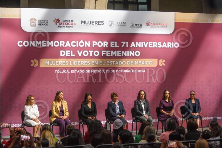 TOLUCA, ESTADO DE MÉXICO, 23OCTUBRE2024.- Delfina Gómez Álvarez, Gobernadora del Estado de México encabezó la Conmemoración por el 71 Aniversario del Voto Femenino, acompañada por Mónica Chávez Durán, Secretaria de las Mujeres, Amalia Pulido Gómez, Consejera Presidenta del IEEM, Mariela Gutiérrez, Senadora por el Estado de México, Martha Patricia Tovar, presidenta del TEEM, realizado en Palacio de Gobierno. FOTO: CRISANTA ESPINOSA AGUILAR /CUARTOSCURO.COM