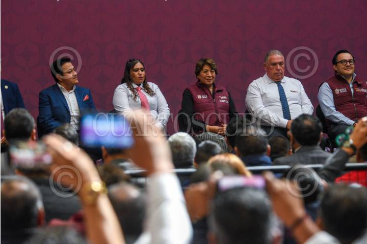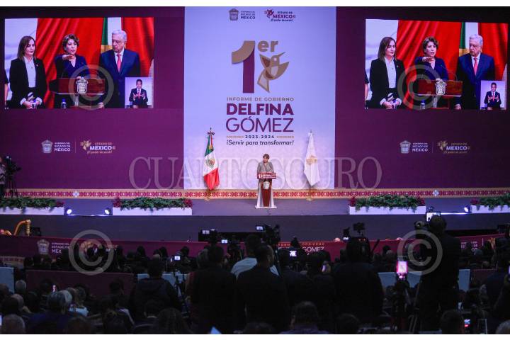 TOLUCA, ESTADO DE MÉXICO, 24SEPTIEMBRE2024.- Delfina Gómez Álvarez, Gobernadora del Estado de México ofreció un mensaje con motivo de su Primer Informe de Gobierno en el Teatro Morelos acompañada por Rosa Isela Rodríguez, Secretaria de Seguridad Pública federal en representación del presiente Andrés Manuel López Obrador, su gabinete, invitados especiales. FOTO: CRISANTA ESPINOSA AGUILAR /CUARTOSCURO.COM