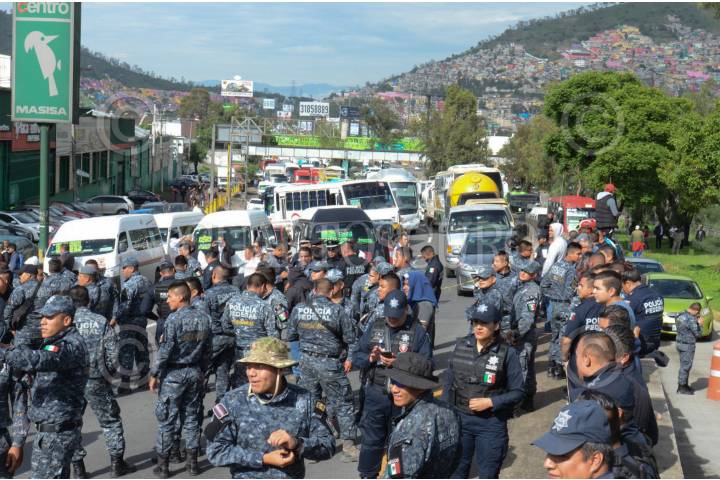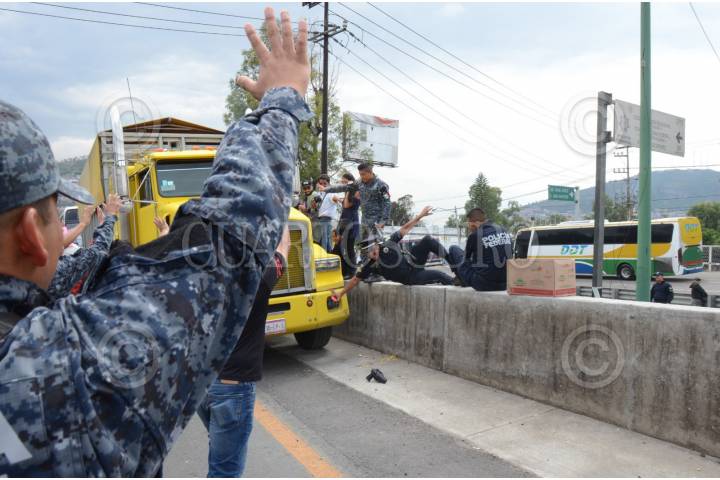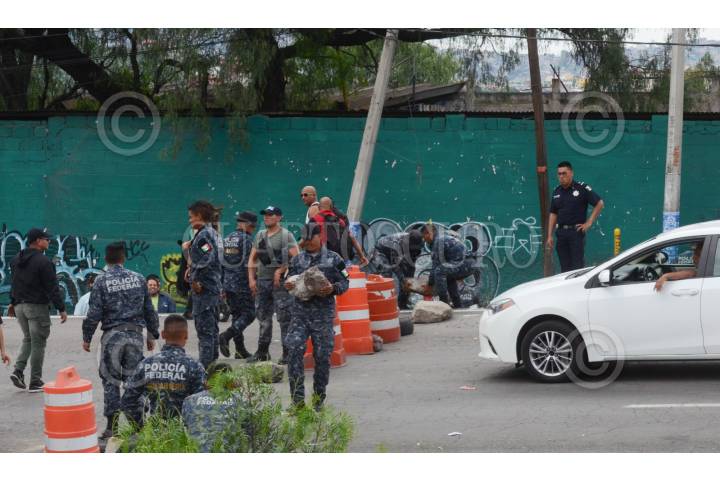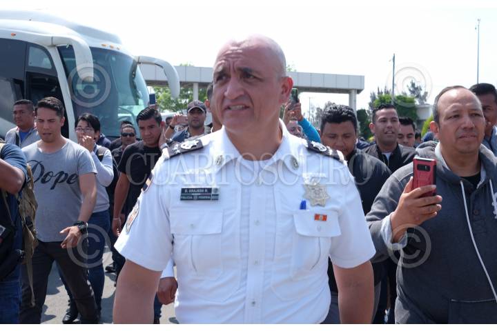 ECATEPEC DE MORELOS, ESTADO DE MÉXICO, 03JULIO2019.- Integrantes de la Policía Federal y Gendarmería bloquearon la autopista México-Pachuca, casi a la altura del Río de los Remedios, para protestar por su reubicación a la Guardia Nacional, ya que ellos argumentan que les bajarán el salario, perderán prestaciones y antigüedad, la movilización causo molestias con las personas que buscaban llegar a sus centros de trabajo. FOTO: ARMANDO MONROY /CUARTOSCURO.COM