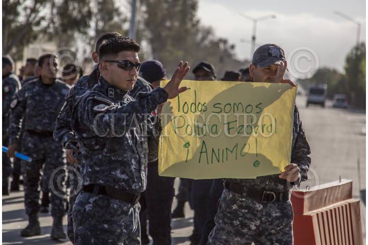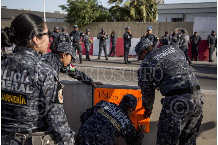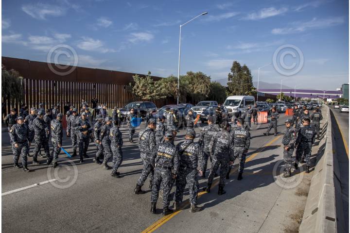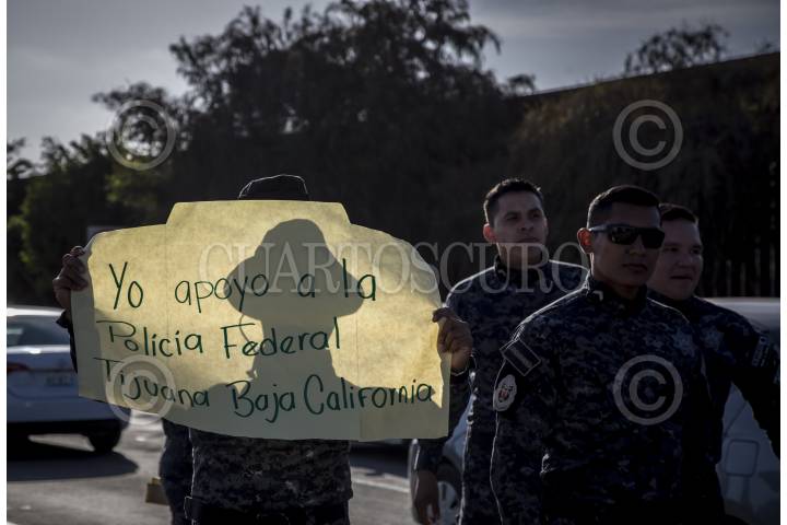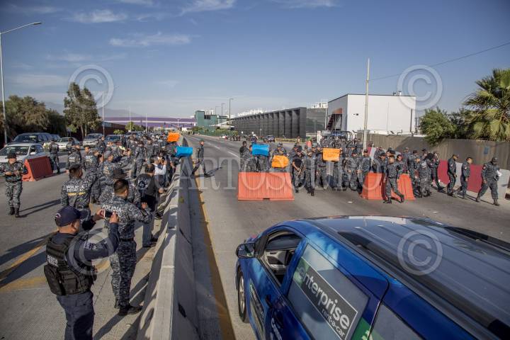 TIJUANA, BAJA CALIFORNIA, 03JULIO2019.- Integrantes de la Policía Federal y Gendarmería bloquearon momentáneamente la avenida Aeropuerto, ubicada a un costado del muro fronterizo que divide a México y Estados Unidos, para protestar por su reubicación a la Guardia Nacional, ya que ellos argumentan que les bajarán el salario, perderán prestaciones y antigüedad, la movilización causo molestias con las personas que transitaban en la zona del Aeropuerto Internacional. FOTO: OMAR MARTÍNEZ /CUARTOSCURO.COM