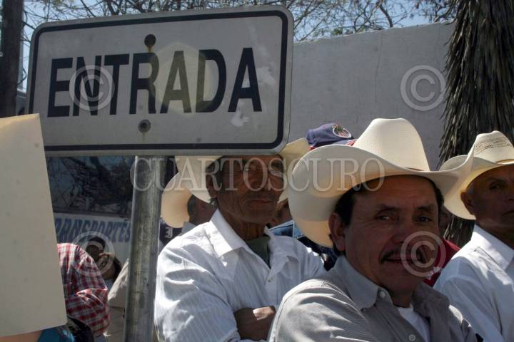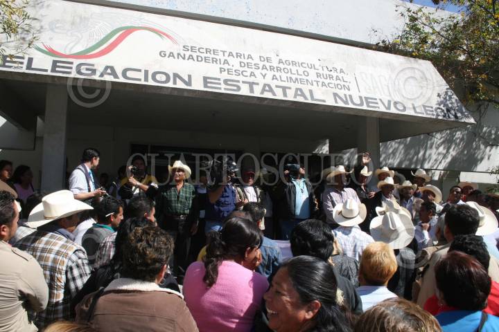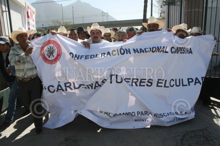 MONTERREY, NUEVO LEON 31ENERO2008.- Cientos de campesinos simpatizantes de la Confederación Nacional Campesina, asentados en los diferentes municipios que conforman el area rural del estado, se manifestaron en las afueras de las oficinas de la delegación de la SAGARPA, para exigir la renuncia del secretario de agricultura Alberto Cardenas,debido a que segun ellos a mostrado incompetencia ante la apertura del TLC, lo cual les ha generado perdidas importantes, y tambien en apoyo al movimiento que se registra en la capital del país, fueron recibidos por el delegado en la entidad el cual recibió un documento con sus demandas. FOTO: PEDRO KRISTIAN LOPEZ/CUARTOSCURIO.COM