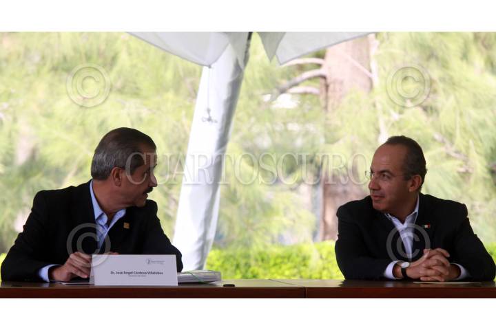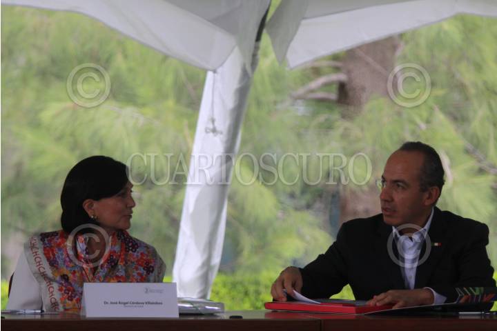 MÉXICO, D.F., 11MAYO2009.- José Ángel Córdova Villalobos secretario Salud, Felipe Calderón Hinojosa Presidente de México conversan durante la presentación del mapa del genoma de los mexicanos, realizado en el monumento Francisco I.Madero de la residencia oficial de los Pinos FOTO:SÁSHENKA GUTIÉRREZ/CUARTOSCURO.COM