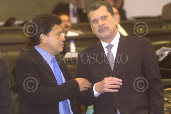 México D.F 27 Abril 2004.- Los senadores del PRI Ricardo Aldana y Enrique Jackson conversan durante la sesión del Senado. FOTO: Eunice Adorno/CUARTOSCURO.COM
