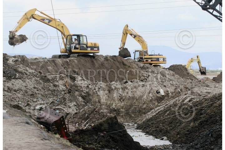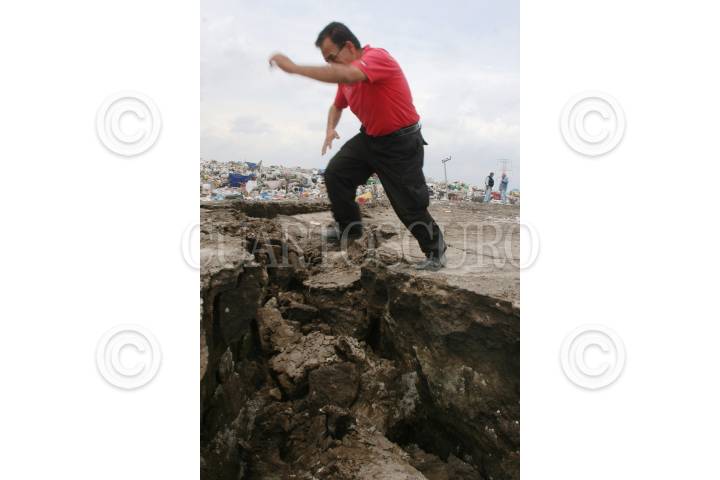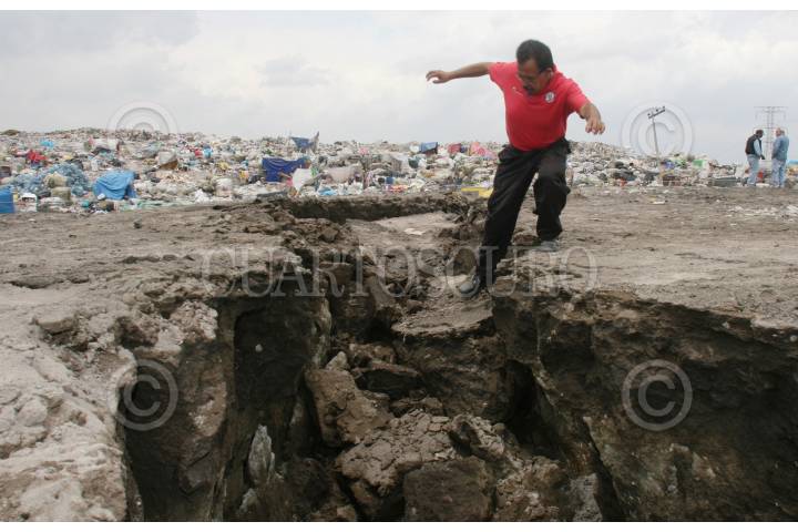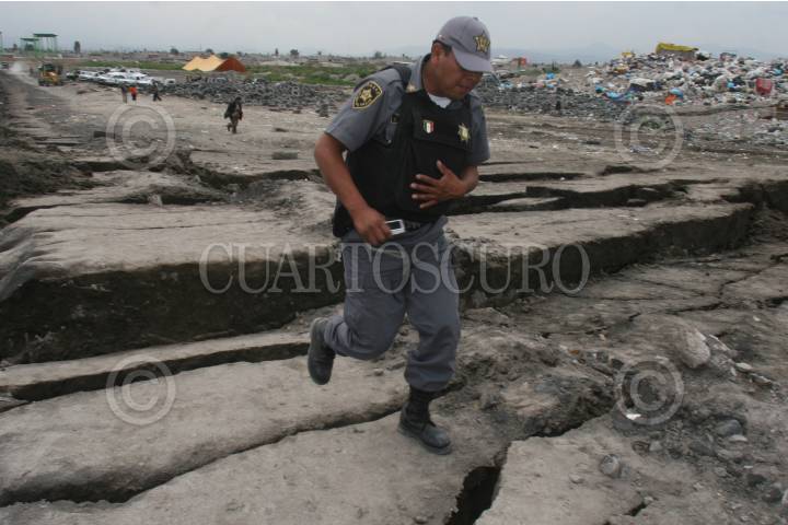 CHIMALHUACÁN, ESTADO DE MÉXICO, 16JUNIO2010.- Trabajadores de la CAEM, protección civil policías municipal y estatal, trabajan en el lugar donde se suscitó un fracturamiento geológico ocasionado por una explosión de gas metano que causo grietas de más de 1 kilómetro en el tiradero municipal de Chimalhuacan. FOTO: SAÚL LÓPEZ/CUARTOSCURO.COM
