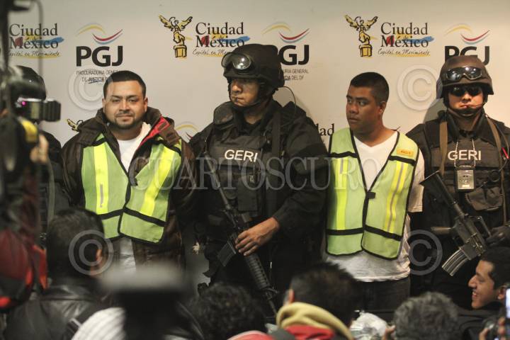 MÉXICO, D.F., 23SEPTIEMBRE2011.- Presentaron ante los medios de comunicación a dos presuntos responsables de las cuatro detenidos por la balacera registrada la noche del miércoles 21 de Septiembre en el restaurante Wings de Polanco, que dejó tres personas muertas FOTO: SAÚL LÓPEZ/CUARTOSCURO.COM