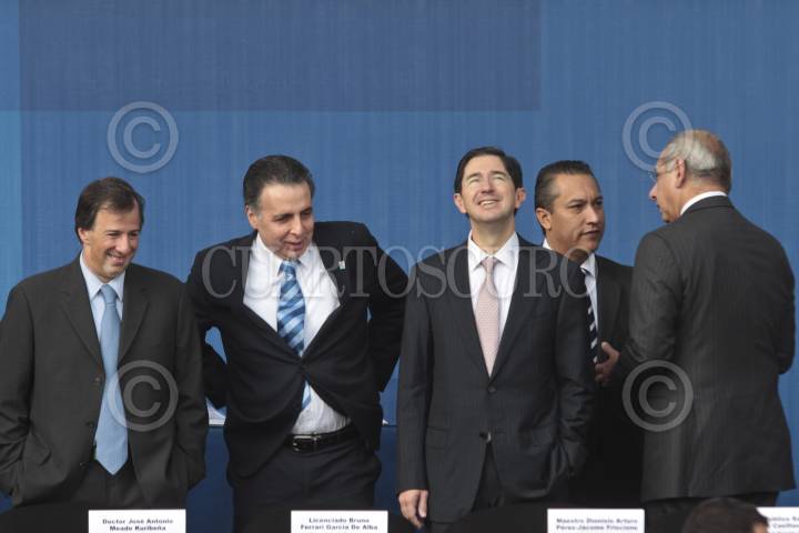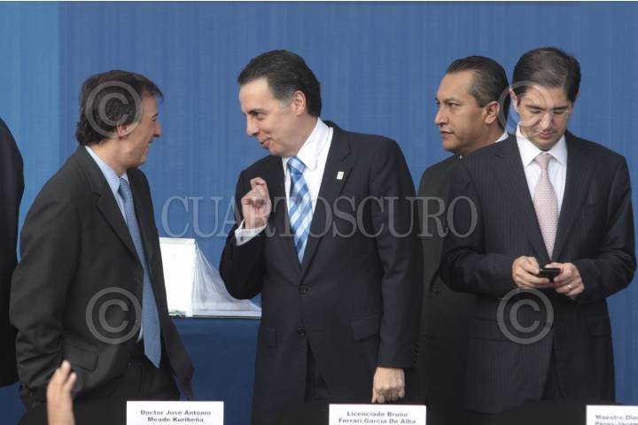 MÉXICO D.F., 16SEPTIEMBRE2011.- Jose Antonio Meade, Secretario de Hacienda junto a Bruno Ferrari, Secretario de Economia y Dionisio Perez, Secretario de Comunicaciones y Transporte durante la ceremonia del CCI Aniversario del Inicio de la Gesta de Independencia que se realizó en la columna del Ángel de la Independencia. FOTO: ENRIQUE ORDÓÑEZ/CUARTOSCURO.COM