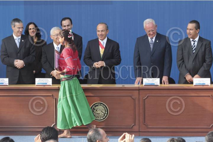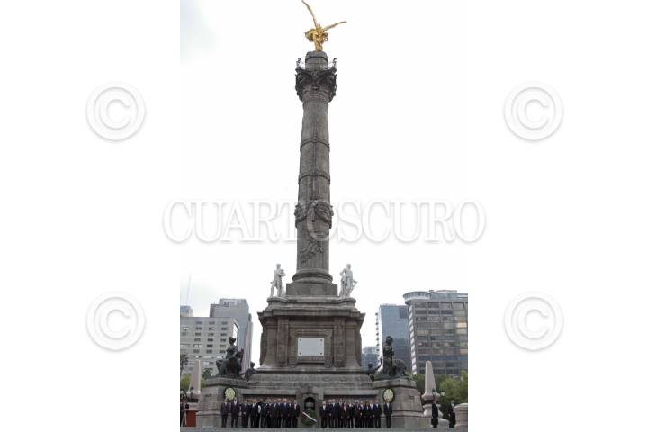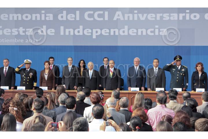 MÉXICO D.F., 16SEPTIEMBRE2011.- Jose Gonzalez Morfin, Presidente de la Mesa Directiva del Senado de la Repuiblica; Emilio Chuayffet Chemor, presidente de la mesa directiva de la Cámara de Diputados; Felipe Calderon, Presidente de México; Juan N. Silva, Ministro Presidente de la SCJN; Francisco Blake Mora, Secretario de Gobernacion durante la ceremonia del CCI Aniversario del Inicio de la Gesta de Independencia que se realizó en la columna del Ángel de la Independencia. FOTO: ENRIQUE ORDÓÑEZ/CUARTOSCURO.COM