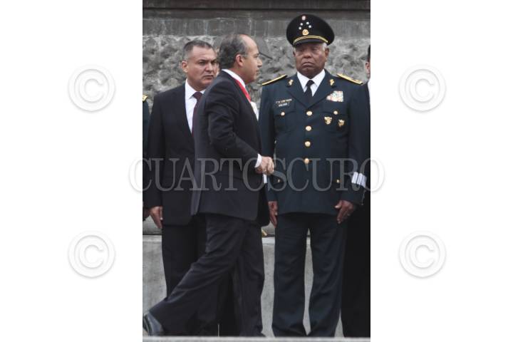 MÉXICO D.F., 16SEPTIEMBRE2011.- Genaro Garcia Luna, Secretario de Seguridad Publica junto Felipe Calderon, Presidente de México y Guillermo Galvan Galvan, Secretario de la Defensa durante la ceremonia del CCI Aniversario del Inicio de la Gesta de Independencia que se realizó en la columna del Ángel de la Independencia. FOTO: ENRIQUE ORDÓÑEZ/CUARTOSCURO.COM