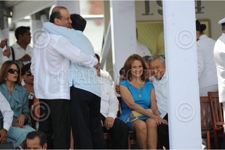 VERACRUZ, VERACRUZ, 21ABRIL204.- Héctor Slim Seade, Christiane Magnani de Alemán y Miguel Alemán, estuvieron presentes en la ceremonia conmemorativa de la gesta heroica en el puerto. FOTO: IVÁN STEPHENS /CUARTOSCURO.COM