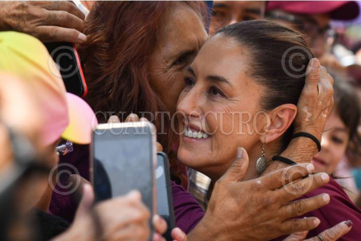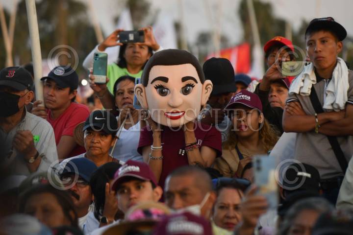 CHALCO DE DÍAZ COVARRUBIAS, ESTADO DE MÉXICO, 11MAYO2024.- Claudia Sheinbaum, candidata a la presidencia por la coalición "Sigamos Haciendo Historia (PT, PVEM y Morena), durante el mitin de campaña realizado en el centro de la entidad. FOTO: MARIO JASSO/CUARTOSCURO.COM