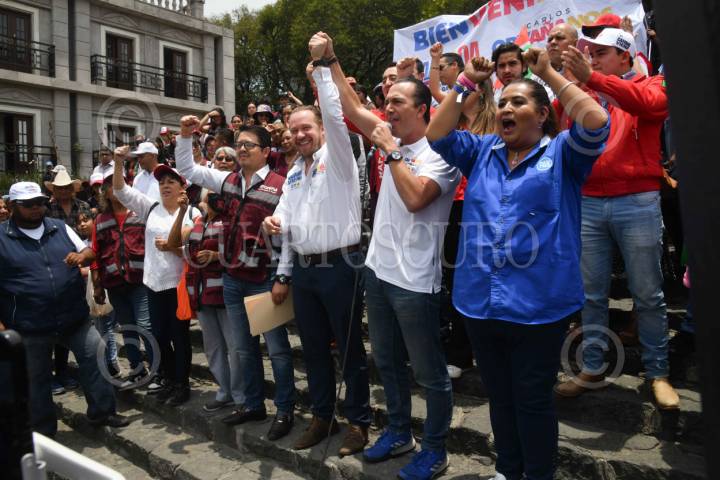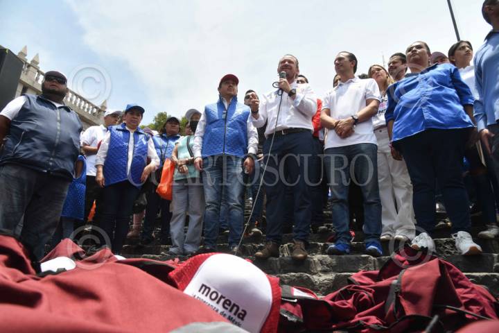 CIUDAD DE MÉXICO, 10MAYO2024.- Santiago Taboada, candidato a la jefatura de gobierno por la coalición "Va por la CDMX" durante su gira de campaña en la alcaldía Cuajimalpa ante ex simpatizantes de Morena quienes declinaron a favor de la coalición conformada por los partidos PAN, PRI y PRD, arrojando las gorras y chalecos del partido guinda. El candidato estuvo acompañado de ex representante de Morena en Cuajimalpa, y Carlos Orvañanos, candidato a la alcaldía de Cuajimalpa. FOTO: MARIO JASSO/CUARTOSCURO.COM