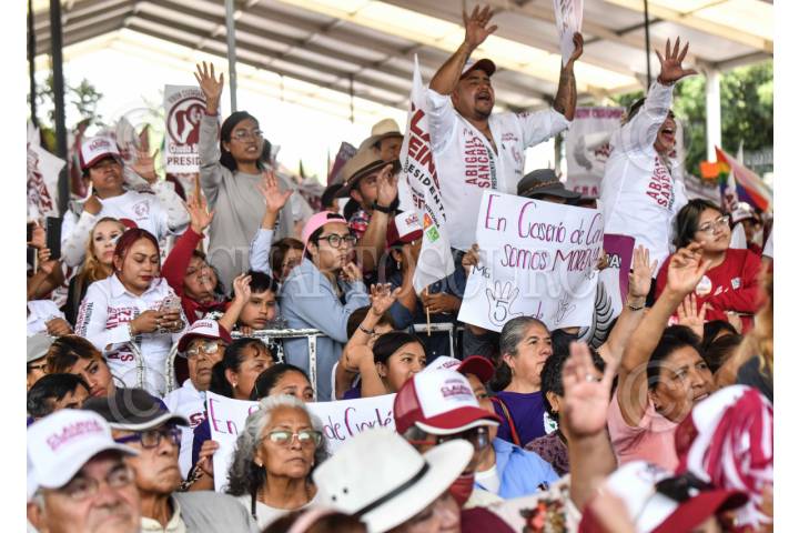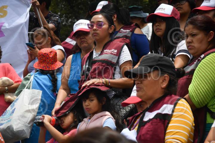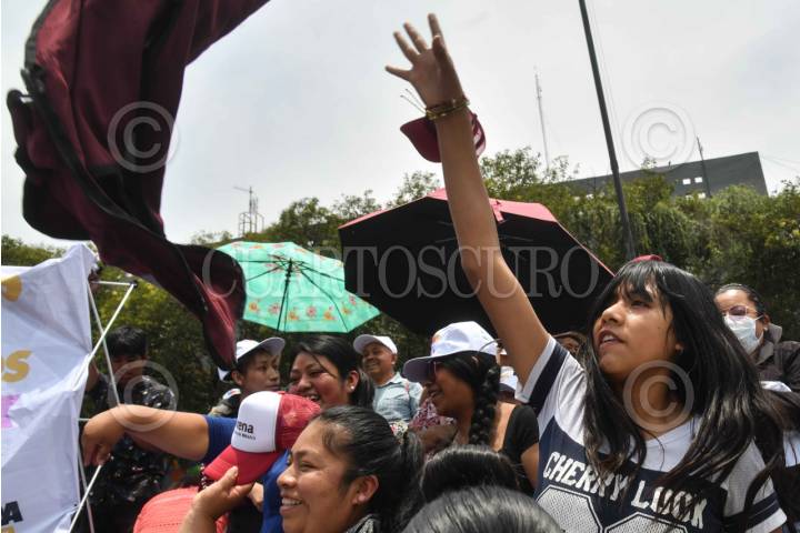 CHALCO DE DÍAZ COVARRUBIAS, ESTADO DE MÉXICO, 11MAYO2024.- Simpatizantes durante el mitin de Claudia Sheinbaum, candidata a la presidencia por la coalición "Sigamos Haciendo Historia (PT, PVEM y Morena), realizado en el centro de la entidad. FOTO: MARIO JASSO/CUARTOSCURO.COM