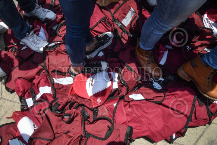 CIUDAD DE MÉXICO, 10MAYO2024.- Santiago Taboada, candidato a la jefatura de gobierno por la coalición "Va por la CDMX" durante su gira de campaña en la alcaldía Cuajimalpa ante ex simpatizantes de Morena quienes declinaron a favor de la coalición conformada por los partidos PAN, PRI y PRD, arrojando y pisando las gorras y chalecos del partido guinda. FOTO: MARIO JASSO/CUARTOSCURO.COM