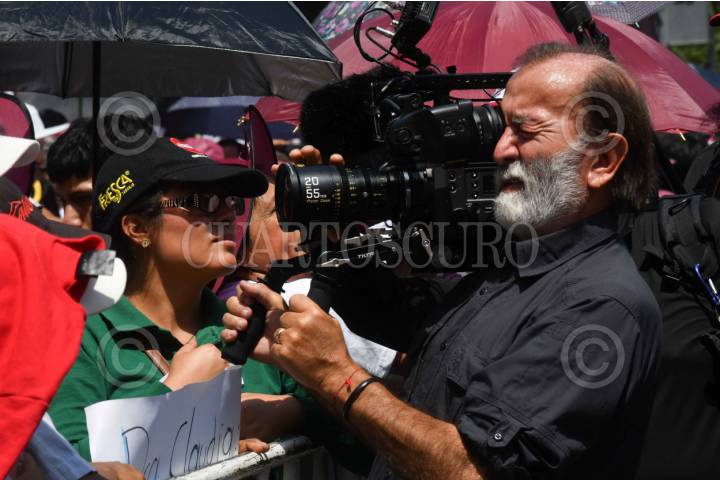 CHALCO DE DÍAZ COVARRUBIAS, ESTADO DE MÉXICO, 11MAYO2024.- Epigmenio Ibarra, productor, durante el mitin de Claudia Sheinbaum, candidata a la presidencia por la coalición "Sigamos Haciendo Historia (PT, PVEM y Morena), realizado en el centro de la entidad. FOTO: MARIO JASSO/CUARTOSCURO.COM
