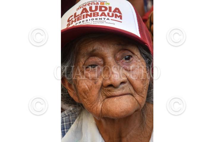 TEXCOCO, ESTADO DE MÉXICO, 11MAYO2024.- Una adulta mayor durante el mitin de Claudia Sheinbaum, candidata a la presidencia por la coalición "Sigamos Haciendo Historia (PT, PVEM y Morena), realizado en la instalaciones de la Feria del Caballo. FOTO: MARIO JASSO/CUARTOSCURO.COM