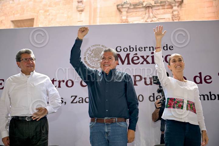 ZACATECAS, ZACATECAS. 10NOVIEMBRE2024.- Ricardo Monreal, presidente de la Jucopo de la Cámara de Diputados y el Gobernador del Estado, David Monreal acompañaron a la Presidenta Claudia Sheinbaum Pardo en el evento en la Plaza de Armas de la capital Zacatecana. FOTO: CUARTOSCURO.COM