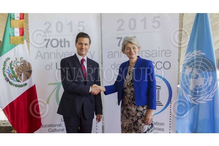 PARÍS, FRANCIA, 16JULIO2015.- Enrique Peña Nieto, recibió en la ciudad de París el Certificado de Inscripción a la Lista del Patrimonio Mundial de la nominación mexicana del Complejo Hidráulico del Acueducto del Padre Tembleque por parte de la UNESCO, en cuya sede sostuvo un encuentro con Irina Bokova, Directora General del Organismo. FOTO: PRESIDENCIA /CUARTOSCURO.COM