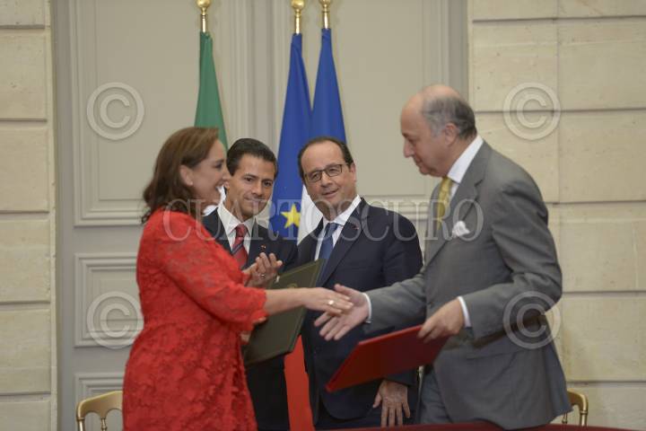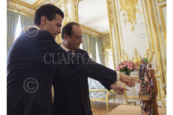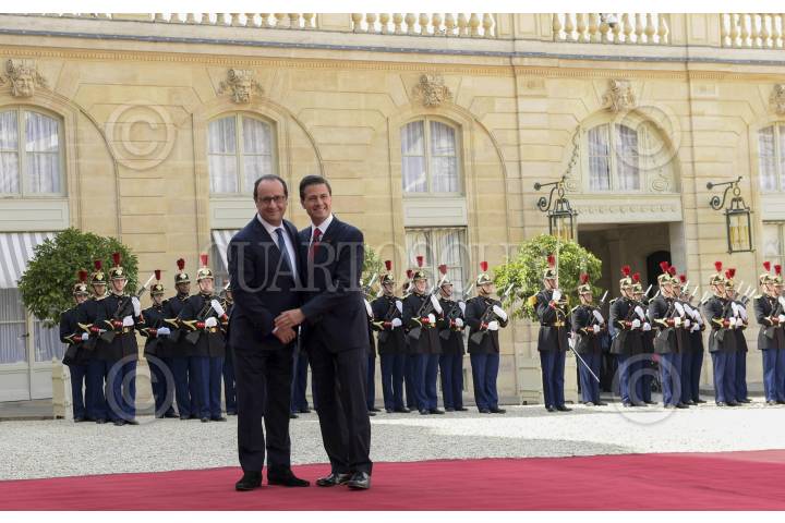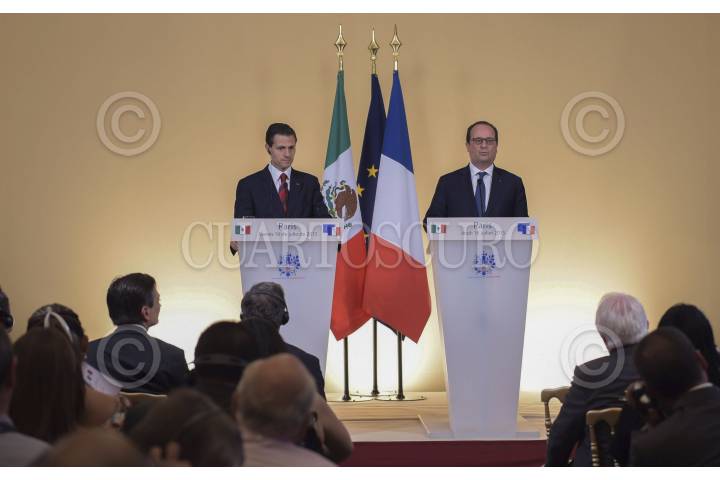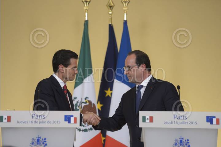 PARÍS, FRANCIA, 16JULIO2015.- El presidente Enrique Peña Nieto, y su homólogo francés, Francois Hollande, sostuvieron una reunión junto con sus comitivas en el Palacio del Elíseo en la que coincidieron en que los compromisos establecidos para avanzar hacia una relación estratégica se han cumplido profundizando los intercambios económicos y de cooperación en ámbitos como ciencia, tecnología, educación, cultura y turismo. FOTO: PRESIDENCIA /CUARTOSCURO.COM