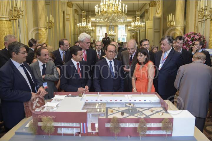 PARÍS, FRANCIA, 16JULIO2015.- El presidente Enrique Peña Nieto, y su homólogo francés, Francois Hollande, conocieron del proyecto arquitectónico Casa Mexicana, del cual suscribieron una declaración conjunta. Ambos recibieron con entusiasmo la posibilidad de que el sector privado mexicano desarrolle un proyecto a las orillas del Sena que tendrá como objetivo promover los intercambios económicos y expresiones culturales mexicanas en París. FOTO: PRESIDENCIA /CUARTOSCURO.COM