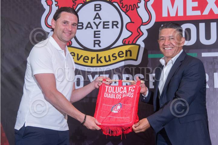 Gerardo Seoane, director técnico del Bayer Leverkusen, junto Ignacio Ambriz, director técnico de Toluca, ofrecieron conferencia de prensa, con motivo del partido entre ambas escuadras que forma parte de la agenda de la gira mundial del equipo alemán.