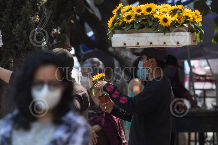 Un joven vendedor de girasoles en la alcaldía Benito Juárez.
