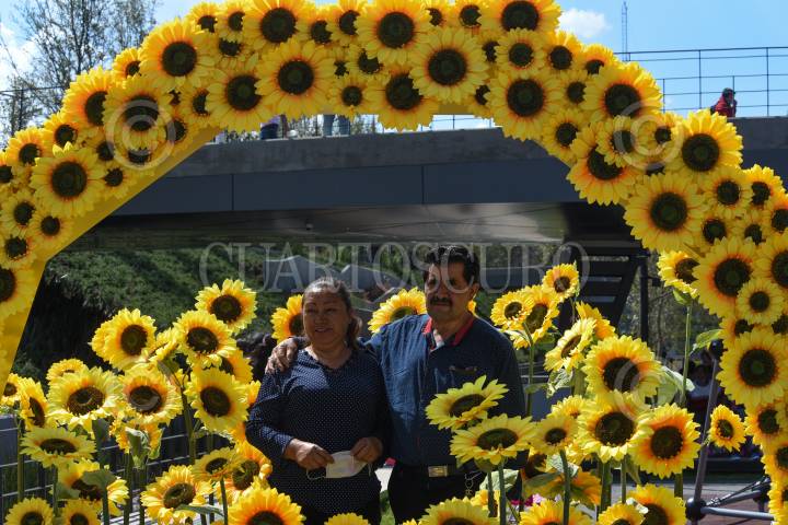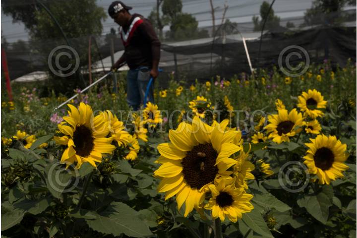 Aspectos de un girasol en el invernadero de Antonio García en Xochimilco que será enviado para su venta en el mercado de flores de dicha alcaldía.