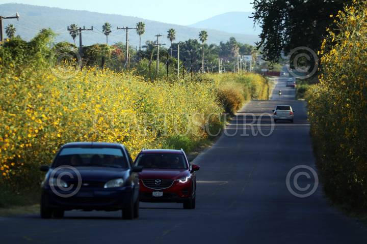 Autos circulan por la carretera Yautepec-Tlaltizapán, en su orilla crecen girasoles silvestres.