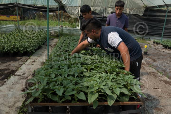 Aspecto de los brotes de girasol, primer paso para su cultivo, en el inveradero de Antonio García en Xochimilco.