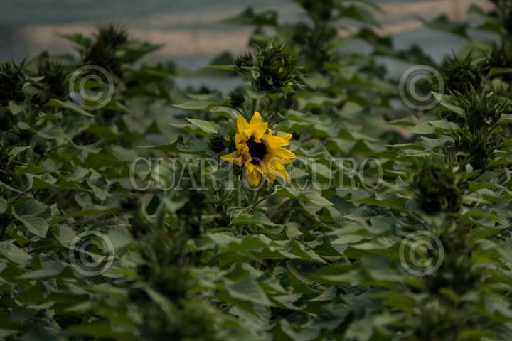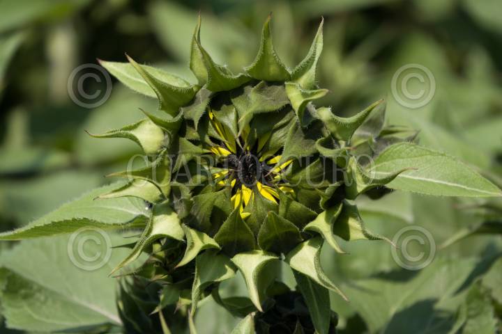 Aspecto de un botón de girasol a punto de abrir que será entregado para la grabación de una serie televisiva.