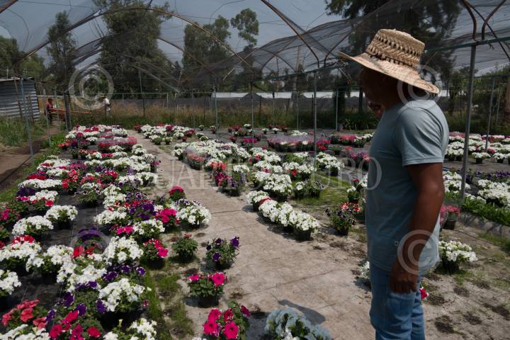 Antonio García observa los ejemplares de petunias que serán enviados para la venta en el mercado de flores de la alcaldía Xochimilco en aras del Día de las Madres