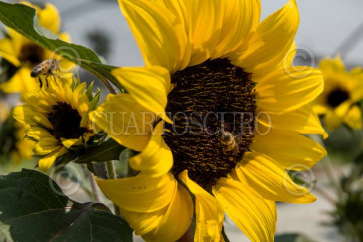 Abejas se posan en las flores de girasol que serán enviados al mercado de flores en Xochimilco en aras del Día de las Madres
