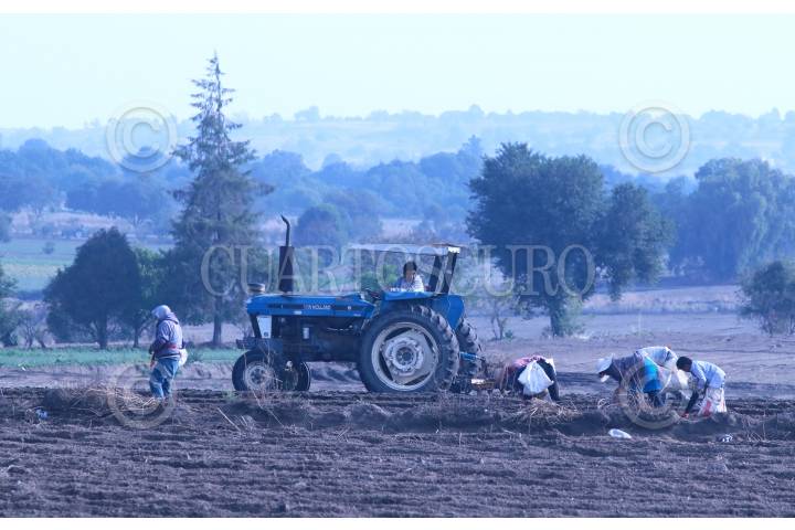 Hombres y mujeres trabajan en una parcela en Tianguismanalco, Puebla
