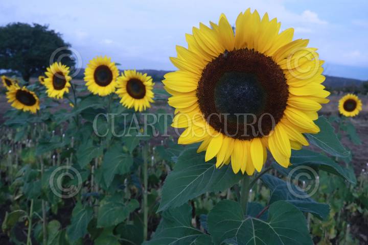 Decenas de girasoles absorben los rayos del sol de la tarde en Tianguismanalco.