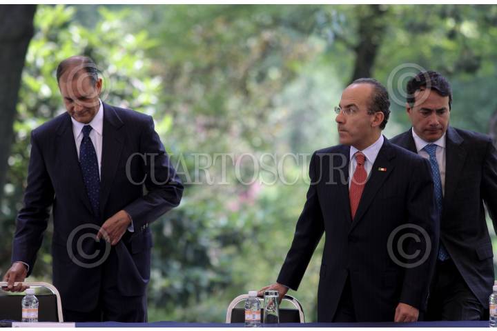 MÉXICO, D.F., 20MAYO2009.- Gerardo Ruíz Mateos, Secretario de Economía, Julio Armando Quesada, presidente del Consejo Ejecutivo de Empresas Globales y Felipe Calderón Hinojosa, Presidente de México, durante el anuncio de inversión del Consejo Ejecutivo de Empresas Globales, en la residencia oficial de Los Pinos. FOTO: MOISÉS PABLO/CUARTOSCURO.COM