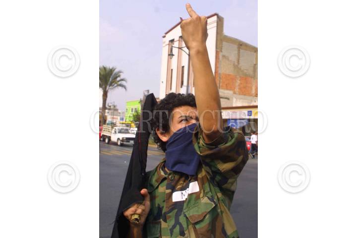 Monterrey, Nuevo León13ENERO2004.- Un joven cubre su identidad, en una de las manifestaciones en contra de la Cumbre de las Américas, el encuentro de mandatarios llega hoy a su fin. Foto: Jorge Lopez/CUARTOSCURO.COM