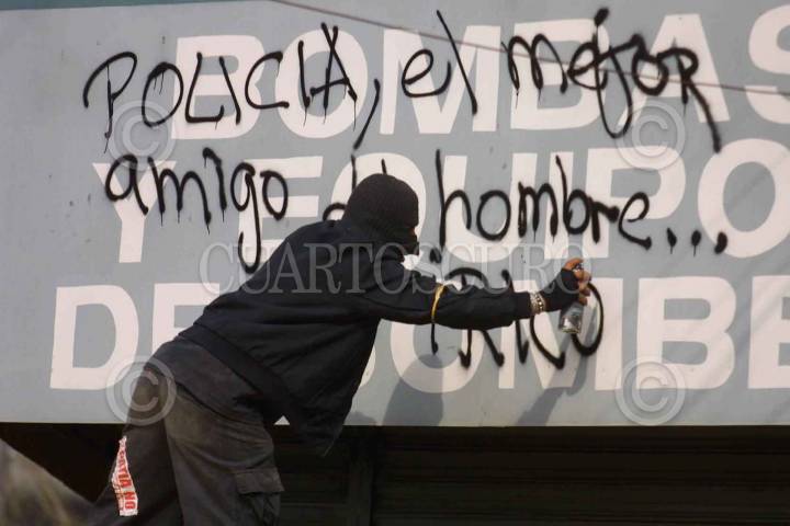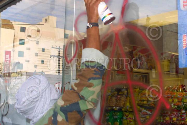Monterrey, Nuevo León 13ENERO2004.- Activistas de los llamados globalifóbicos, se manifestaron en contra de la Cumbre de las Américas haciendo pintas en aparadores de los comercios de las calles de la ciudad regia. El encuentro llega hoy a su fin. Foto: Jorge López/CUARTOSCURO.COM