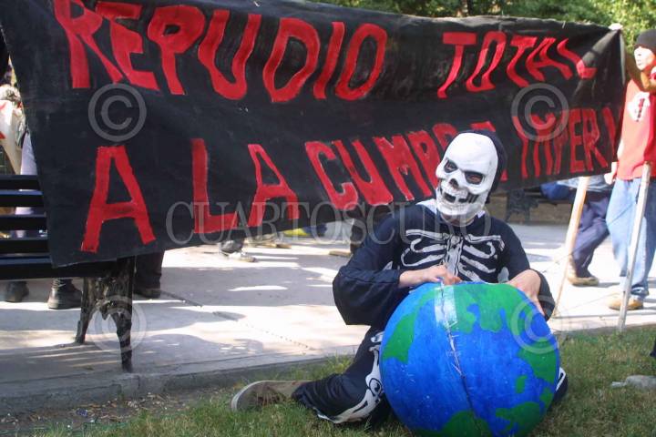 Monterrey, Nuevo León 13ENERO2004.- Las protestas en contra de la Cumbre de las Américas, se realizaron con tranquilidad en las calles de la ciudad Regia. Como ya es costumbre jóvenes provenientes de diversos puntos del país se manifestaron en contra de esta encuentro de primeros mandatarios americanos. Foto: Jorge López/CUARTOSCURO.COM