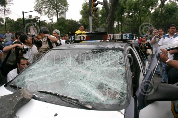 MEXICO, D.F., 16 MARZO2006.- Una patrulla fue destrozada por algunos manifestantes durante la marcha que realizaron varios grupos sociales en contra del IV Foro Mundial del Agua. FOTO: Pedro Marrufo/CUARTOSCURO.COM