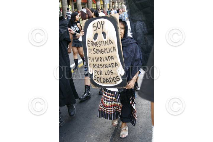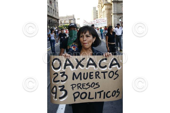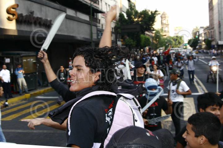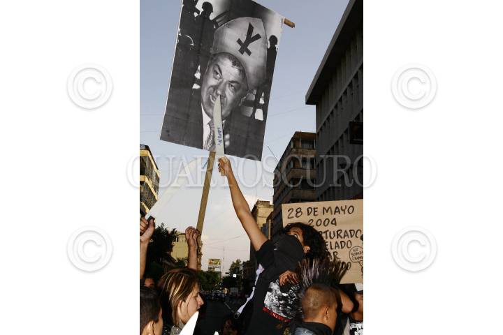 GUADALAJARA, JALISCO. MEXICO., 28 MAYO 2007.- Altermundistas y globalifobicos conmemoraron el tercer aniversario del enfrentamiento que tuvieron con la fuerza publica en el marco de la tercera cumbre de Jefes de estado de América Lantina El Caribe y la Unión Europea. En la manifestación se exigió que el actual Secretario de Gobernación el entonces gobernador de Jalisco Francisco Javier Ramirez Acuña sea castigado por los abusos que cometieron los Policias. FOTO: JOSE MARIA MARTINEZ/CUARTOSCURO.COM