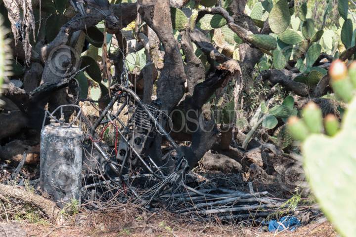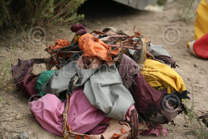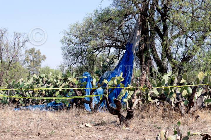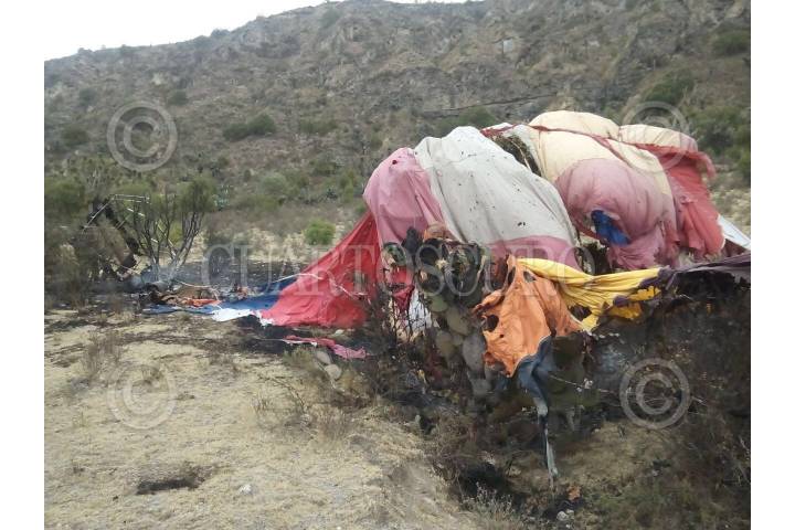 AGUA BLANCA, HIDALGO, 21MARZO2016.- Policias y personal del municipio sacan los restos de un globo aerostático que se incendio volando y se desplomó en la barranca del Yolo ubicado en los límites del municipio de Acatlán y Agua Blanca, dicho accidente dejo como saldo dos personas sin vida y alrededor de ocho personas lesionadas con quemaduras de primer grado. FOTO: SAÚL LÓPEZ /CUARTOSCURO.COM