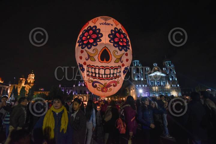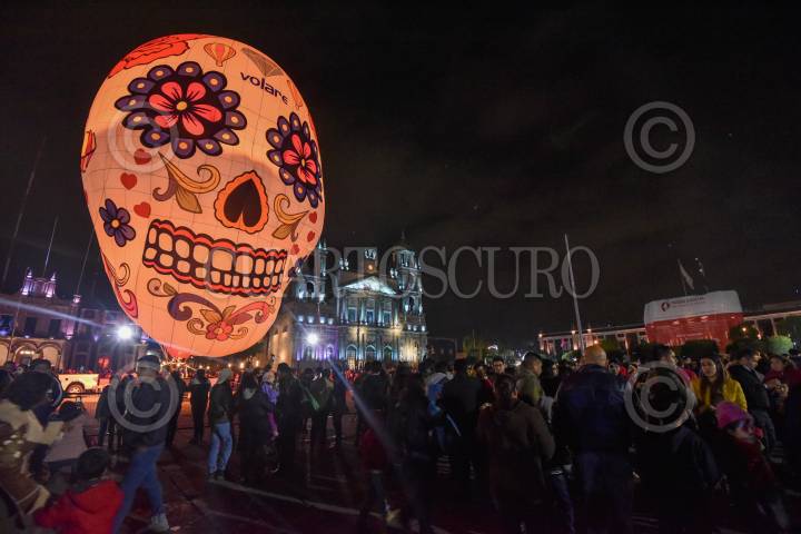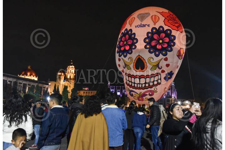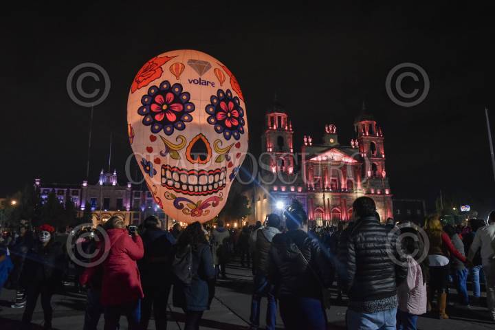 TOLUCA, ESTADO DE MÉXICO, 01NOVIEMBRE2019.- Como parte de las actividades del Festival del Alfeñique en Toluca fue instalado un globo aerostático con figura de calavera en la Plaza de los Mártires, los visitantes se tomaron la foto del recuerdo. FOTO: CRISANTA ESPINOSA AGUILAR /CUARTOSCURO.COM