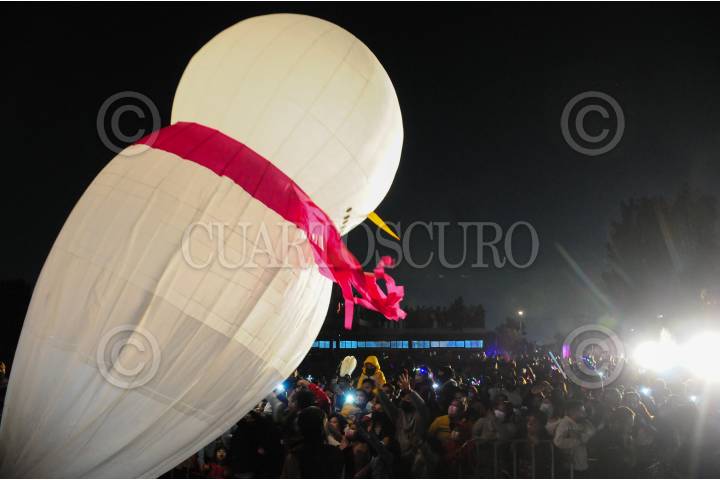Un globo de cantoya comienza a elevarse dentro del festival de globos de cantoya organizado por la alcaldía Iztapalapa.