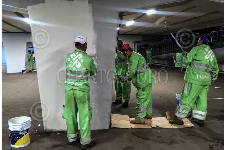 CIUDAD DE MÉXICO, 17AGOSTO2019.- Luego de que las manifestantes del día de ayer pintaran paredes y rompieran cristales, elementos de limpieza de la Ciudad se quedaron por la noche a restaurar las inmediaciones de la Estación Insurgentes. FOTO: ANDREA MURCIA /CUARTOSCURO.COM