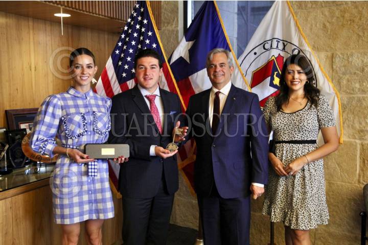Samuel Garcia Sepúlveda, gobernador electo de Nuevo León, recibió del alcalde de Austin, Texas, Steve Adler, la llave de la ciudad, acompañado de su esposa Mariana Rodríguez.