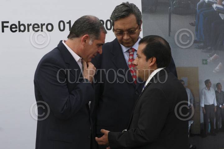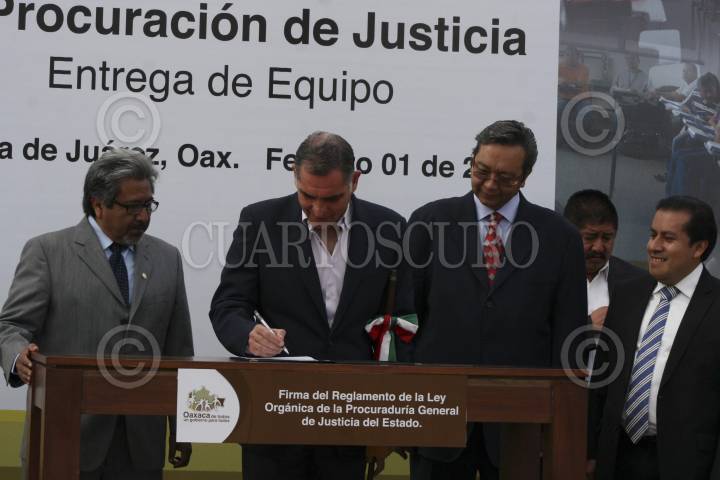 REYES MANTECÓN, OAXACA, 01FEBRERO2013.- Gabino Cué, gobernador del estado, acompañado del procurador General de Justicia de Oaxaca (PGJEO), Manuel de Jesús López López firmó este viernes el reglamento de la Ley Orgánica de la PGJEO para la modernización de los sistemas de justicia, además, anunció un incremento salarial del 18 % para los empleados de la procuraduría e hizo la entrega de equipo, computadoras, vehículos, chalecos, entre otras cosas. La entrega se llevó a cabo en la explanada del edificio Jesús "Chu" Rasgado de ciudad Judicial. El mandatario le llamó la atención al procurador, pues pretendía entregar parte del armamento y no pudo. FOTO: ARTURO PÉREZ ALFONSO /CUARTOSCURO.COM